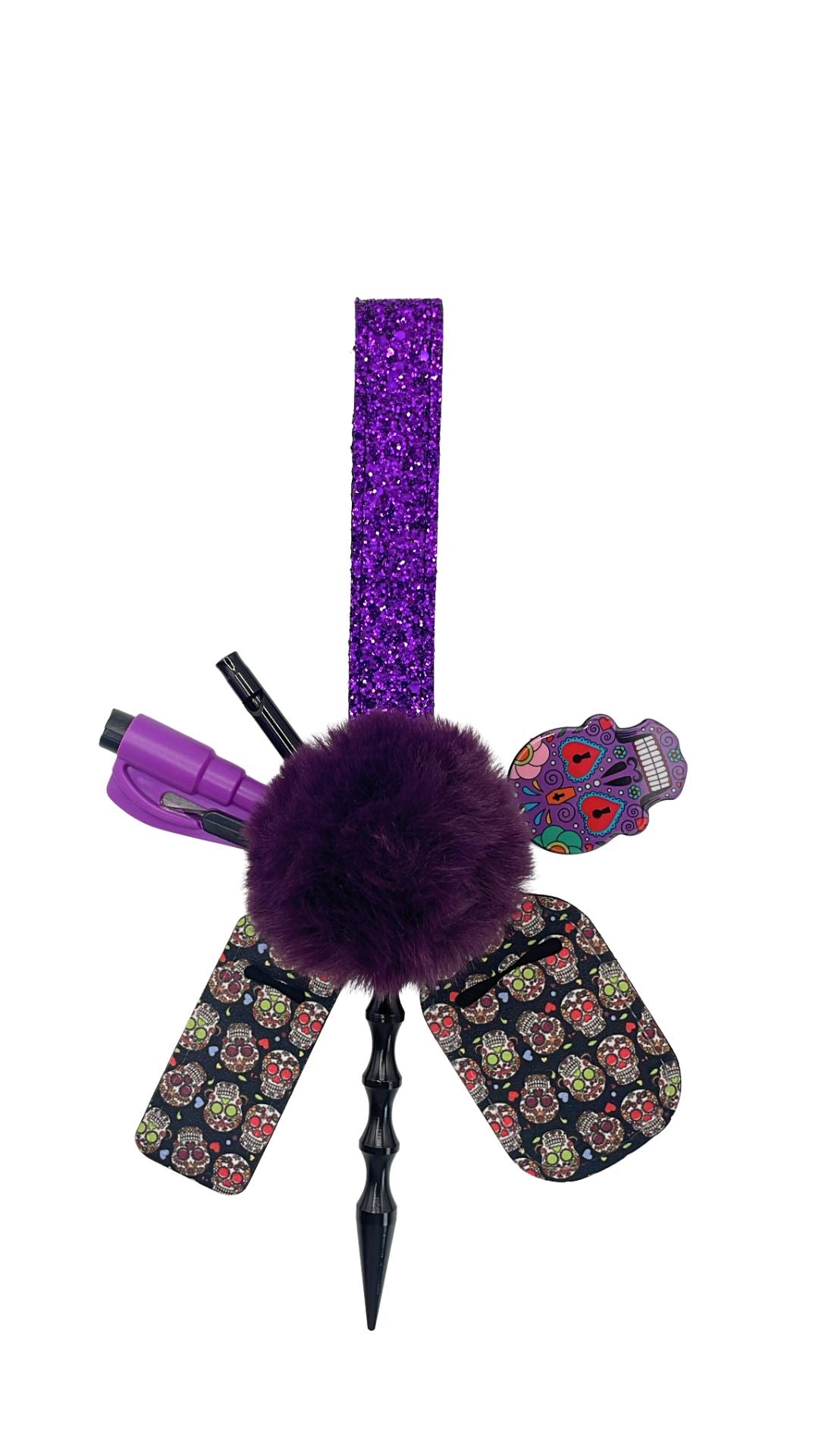 Handmade with attention to detail, Miss.Skully is a keychain that provides essential everyday protection. Features include a seatbelt cutter/window breaker, a sugar skull charm, a Chapstick holder with Chapstick included, a pompom, optional pepper spray sold separately, a Kubaton, an emergency whistle, and hand sanitizer. Carry Miss.Skully and feel safe and stylish.
