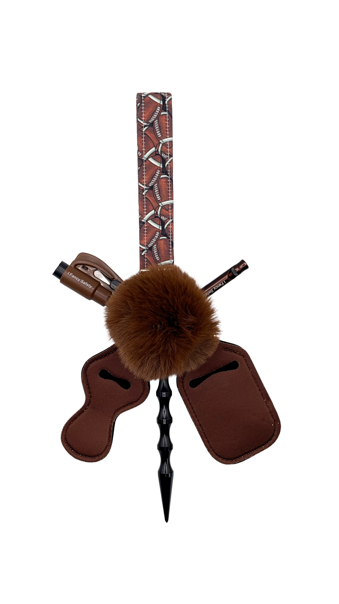 The Kick Off Keychain is a handmade cloth wristlet that provides a convenient way to stay safe and look stylish. It features an seatbelt cutter/window breaker, Chapstick holder, pompom, Kubaton, emergency whistle, hand sanitizer so you can be prepared for any situation.