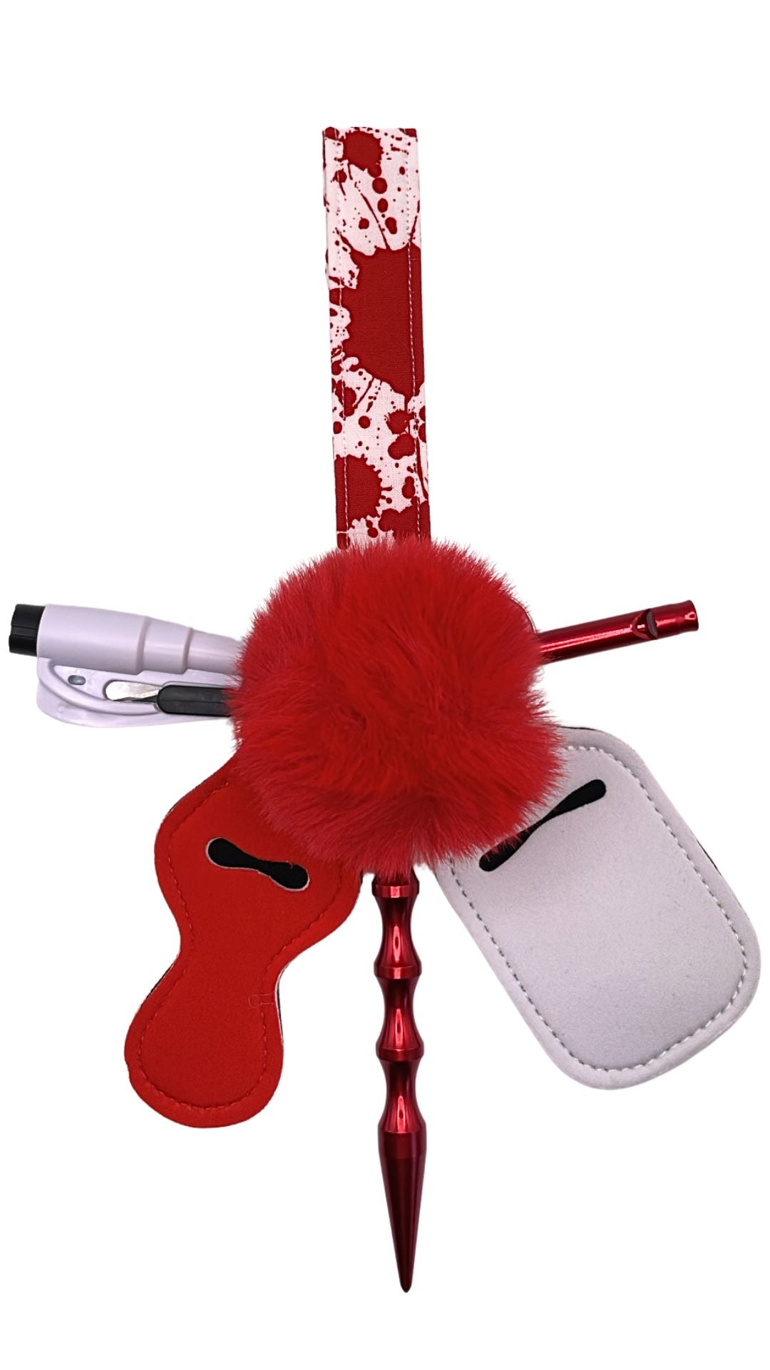 Introducing Slasher Keychain, the essential everyday keychain. This multifunctional accessory includes a blood splattered wristlet for style, emergency whistle for safety, seatbelt cutter/window breaker for emergencies, and a chapstick and hand sanitizer holder with provided products.