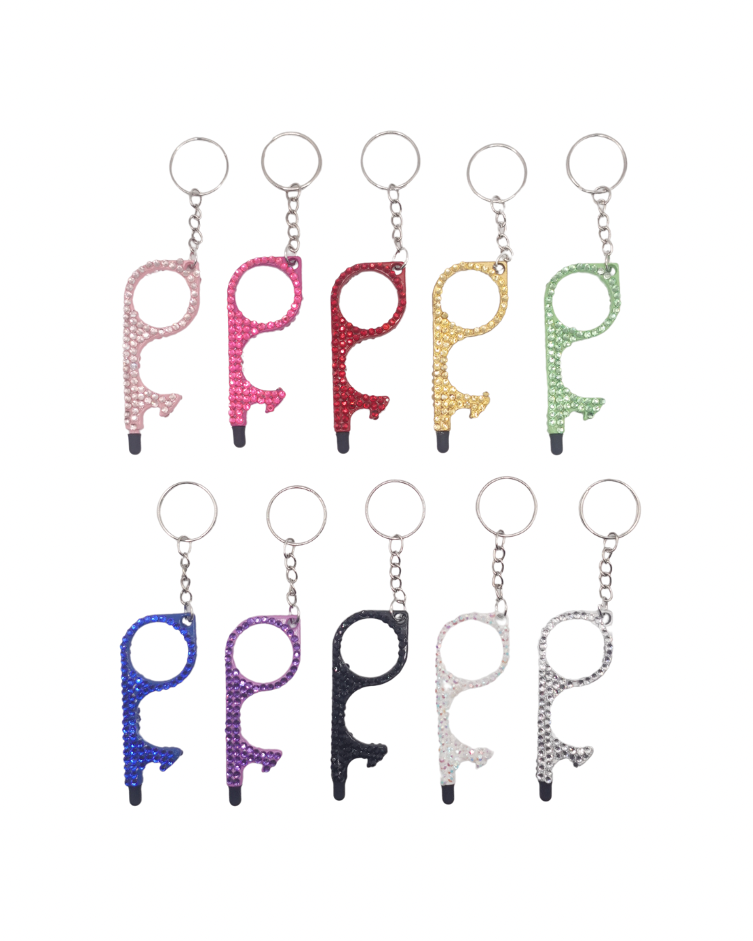 This Hand-blinged No Touch Keychain is the perfect companion for everyday tasks. It features a touchless door opener, button pusher, stylus, and grocery bag holder, all on one stylish keychain - so you can stay safe and stay in style. Rely on its superior build and function to get you through your day.