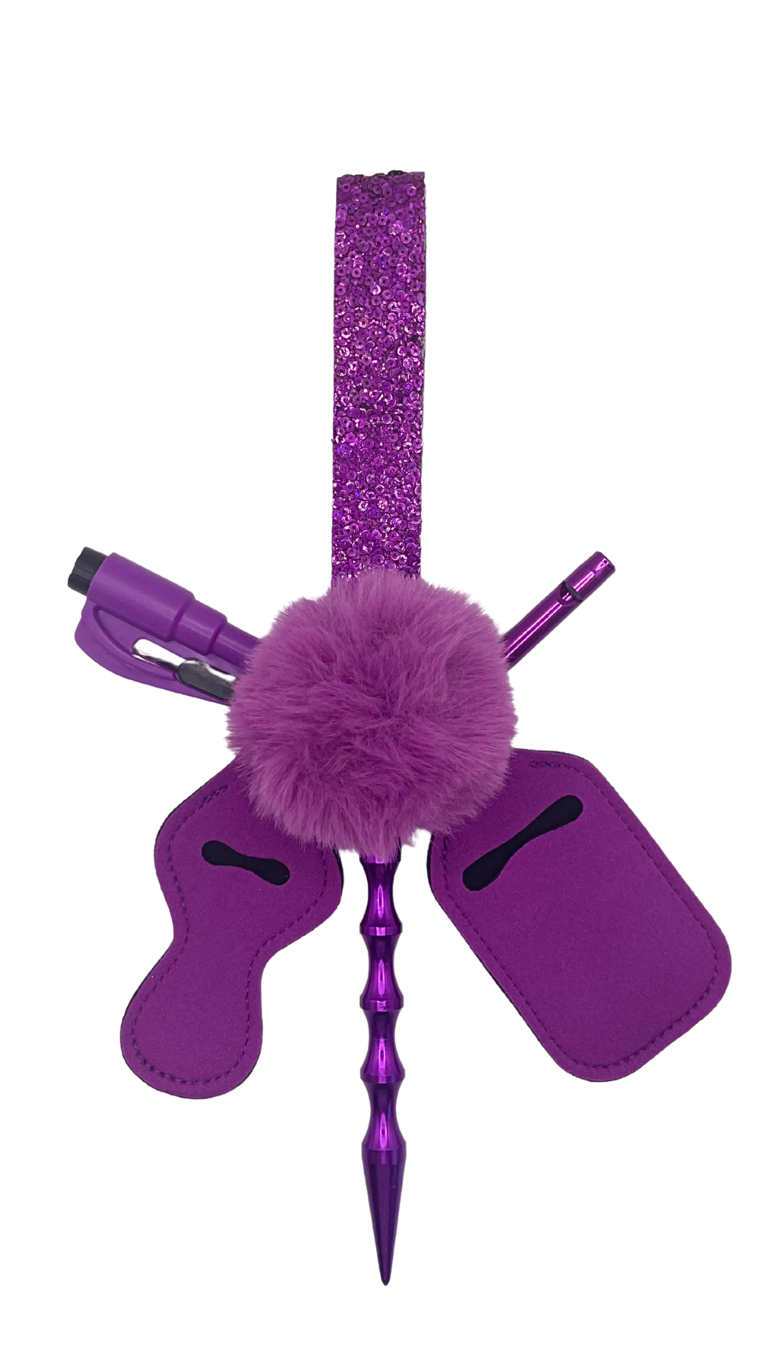 I Am Deserving is a Domestic Violence Awareness inspired keychain set. Its handmade purple sequin wristlet, turns a thoughtful detail into an essential you’ll carry everywhere. Each set includes carefully chosen tools — Handmade wristlet, soft pompom, emergency whistle, seatbelt cutter/ window breaker, chapstick and hand sanitizers filled up, and a kubaton— blending practicality with style in a way that feels effortless.