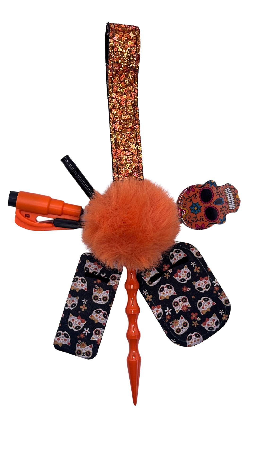 This Naranja Skull wristlet is handmade and includes essential safety features like a seatbelt cutter, window breaker, a Kubaton, and an emergency whistle. Patrons can also enjoy extras like a charm, pompom, a chapstick holder with included chapstick, and hand sanitizer. Keep yourself safe and fashionable.