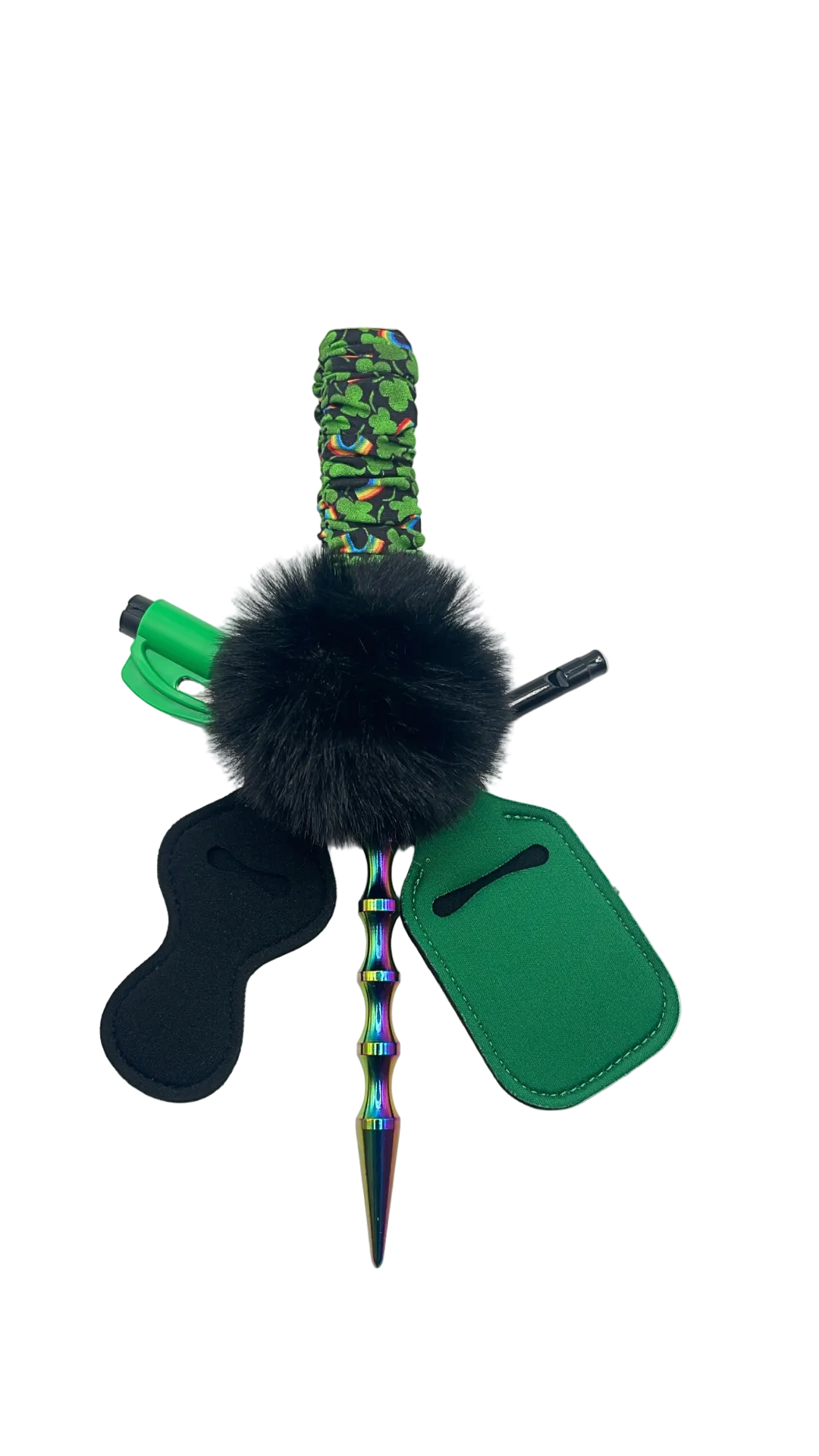 Get ready to elevate your personal safety game with Garden of Luck! This stylish scrunchie wristlet includes essential safety features such as a kubaton, seatbelt cutter/window breaker, and emergency whistle. The perfect accessory for any outing, it also includes a chapstick and hand sanitizer holder, and a pom pom.