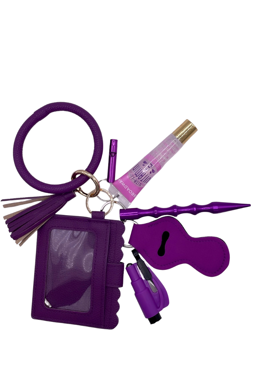 This Plum Kisses wristlet provides the perfect blend of security and convenience. It comes with a tassel, wallet, Kubaton, seat belt cutter/window breaker, ChapStick holder, whistle, and lip gloss. Optional pepper spray gives an extra layer of protection. Keep your essentials organized and secured in style.