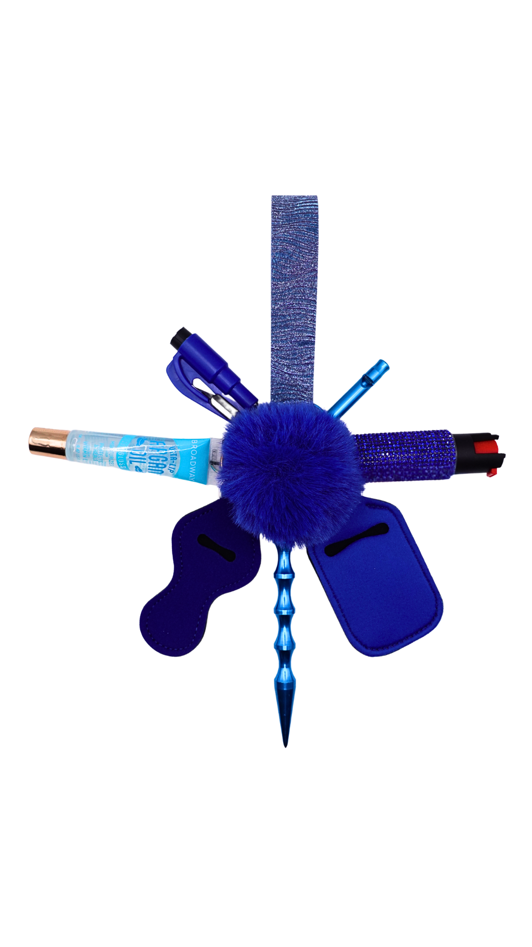 Stay prepared and stylish with our Royal Blue Shimmer wristlet. Handmade and adorned with a pompom, this wristlet features a chapstick holder and bling hand sanitizer. With options for pepper spray and an emergency whistle, you'll have peace of mind wherever you go. Upgrade your accessories with this all-in-one essential.