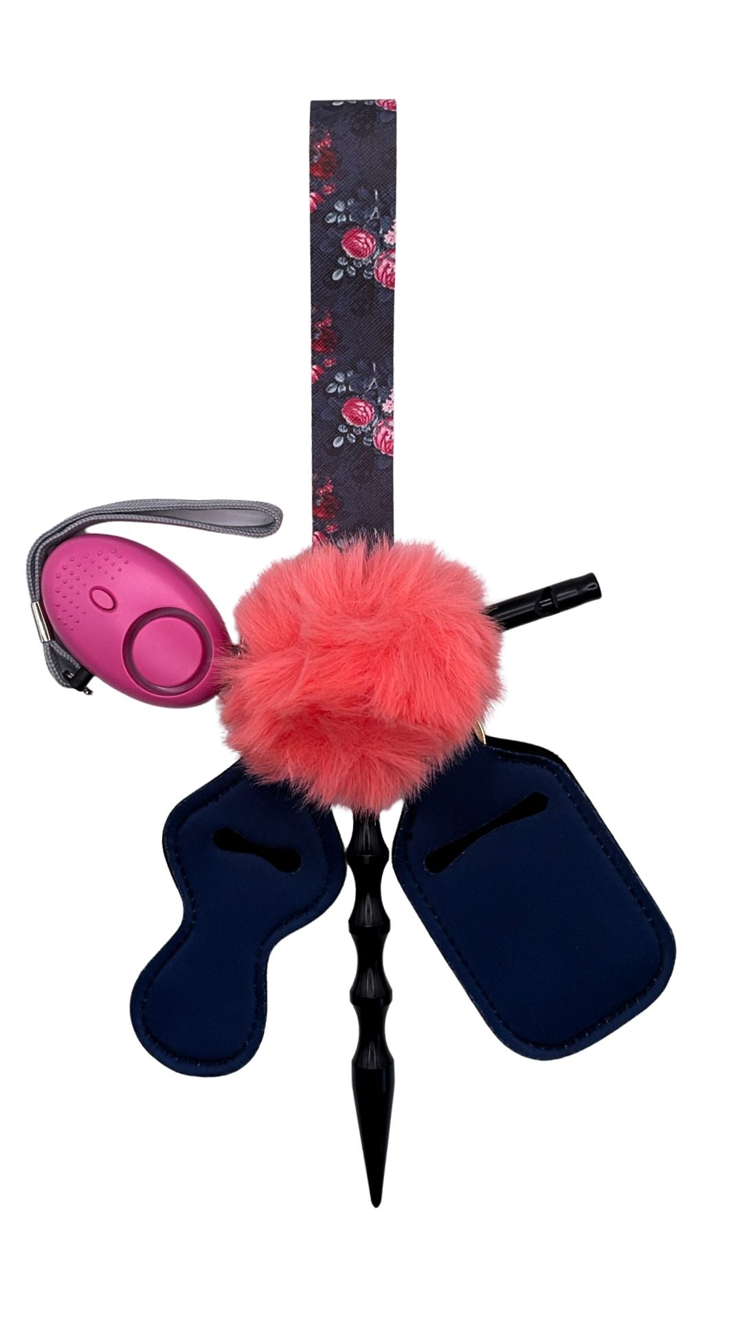 This handmade faux leather wristlet with skulls and roses features a pompom, kubaton, chapstick holder. It also includes a hand sanitizer holder, alarm/flashlight, and emergency whistle. Stay stylish and prepared with this versatile wristlet.